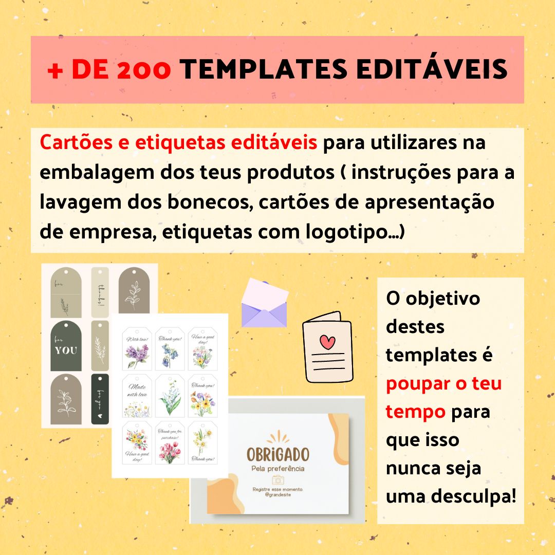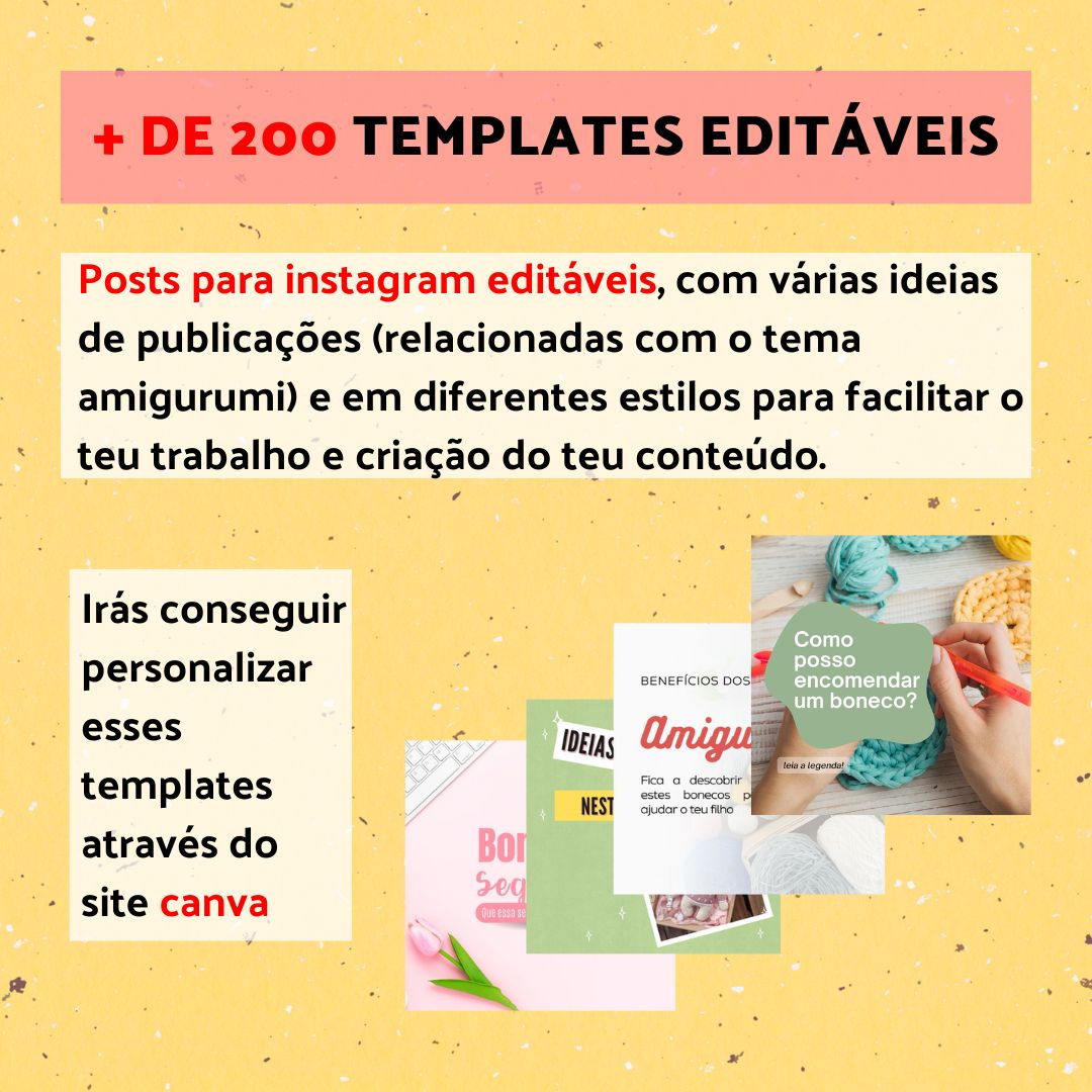 -Mais de 200 templates editáveis (Posts para Instagram relacionados com o tema amigurumi, cartões e etiquetas editáveis para utilizares na embalagem dos teus produtos.