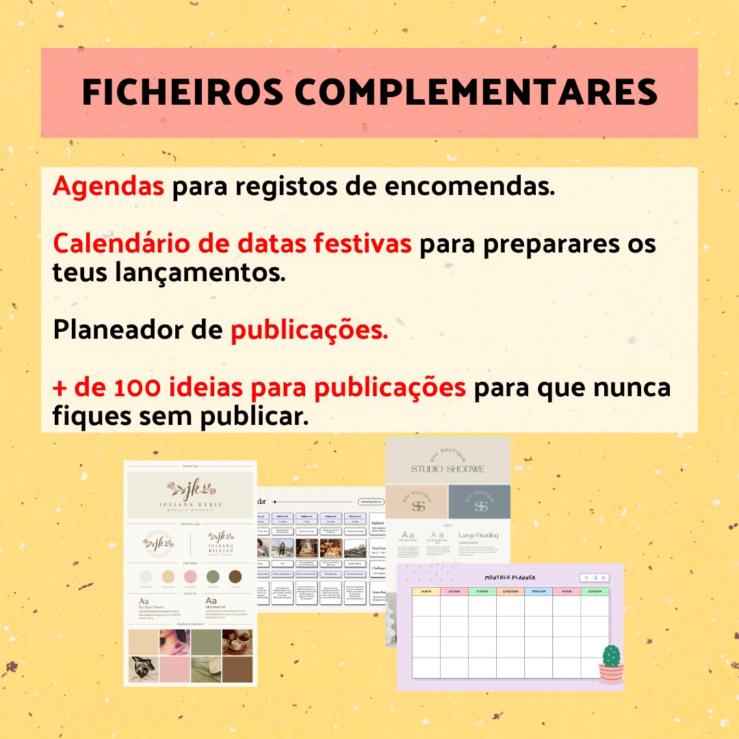 -Ficheiros complementares (Agendas para registos de encomendas, calendário de datas festivas para preparares os teus lançamentos, planeador de publicações, lista com + de 100 ideias para publicações para que nunca fiques sem publicar.)